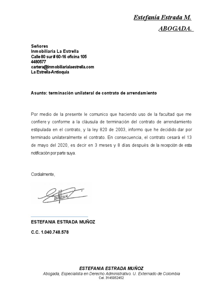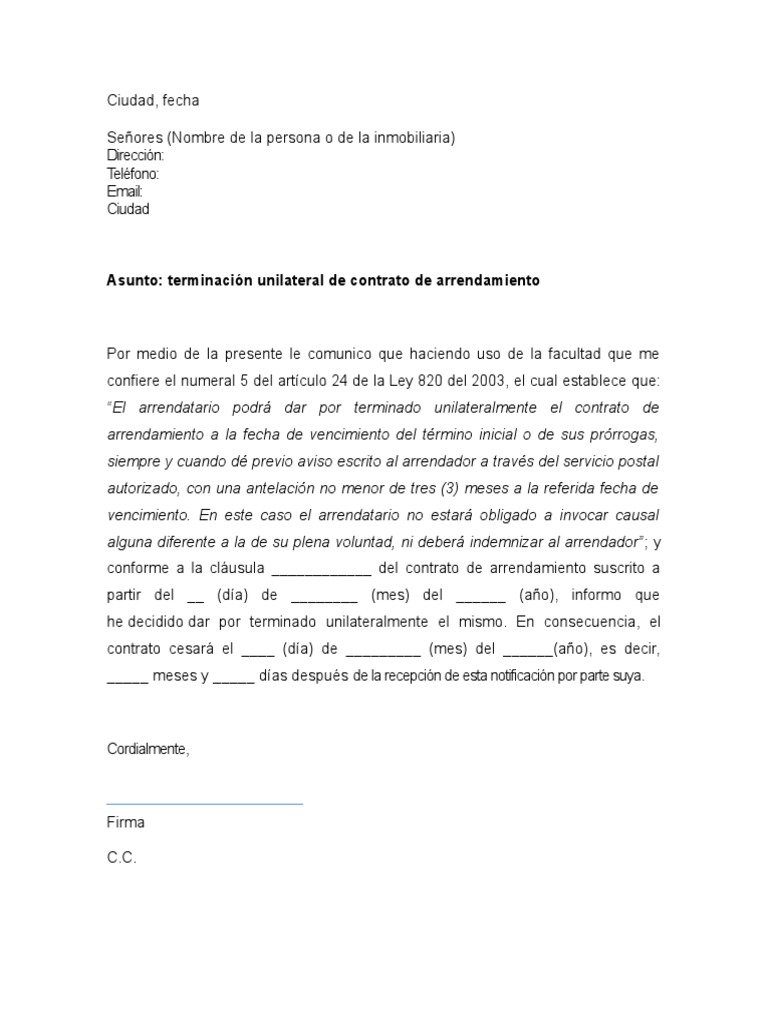 Estimada señora ______________ nombre y apellido del inquilino le escribo esta carta a fin de indicarle que lamentablemente me veo en la penosa necesidad de rescindir del contrato de arrendamiento Nº ____ de fecha ________ día mes y año. Por parte del ARRENDADOR Ø Conforme al artículo 23 literal a de la ley 820 de 2003 el arrendador debe hacer ésta comunicación a través del servicio postal autorizado al arrendatario o a su representante legal con una antelación mínima de 3 meses a la terminación del contrato o una de sus. Your Carta de terminacion de contrato de arrendamiento photographs are available in this site. Carta de terminacion de contrato de arrendamiento are a topic that has been hunted for and liked by netizens today. You can Find and Download or bookmark the Carta de terminacion de contrato de arrendamiento files here