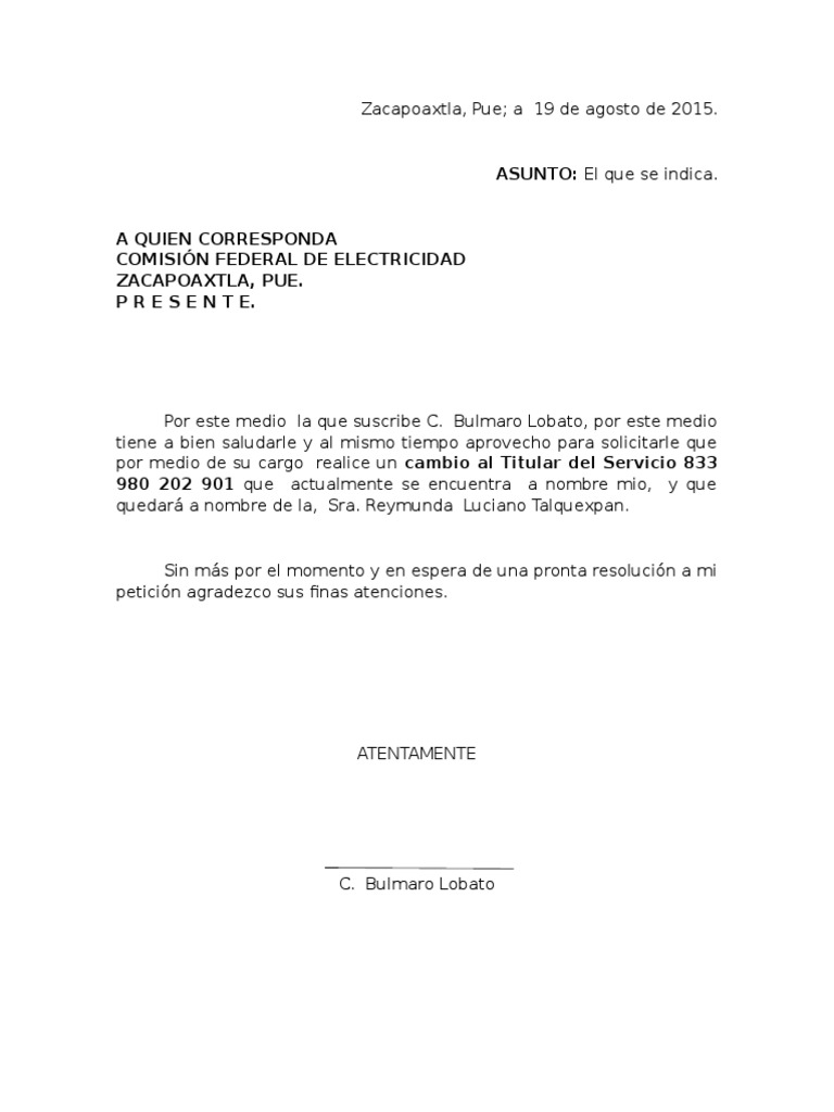 A la Comisión Federal de Electricidad les remito este escrito para solicitar el cambio de titular del contrato de suministro eléctrico del siguiente domicilio. El ex cónyuge que se ha quedado a vivir en la casa tendrá que ser el responsable del pago del recibo de luz. Your Carta para cambio de nombre cfe picture are available in this site. Carta para cambio de nombre cfe are a topic that has been searched for and liked by netizens now. You can Get or bookmark the Carta para cambio de nombre cfe files here