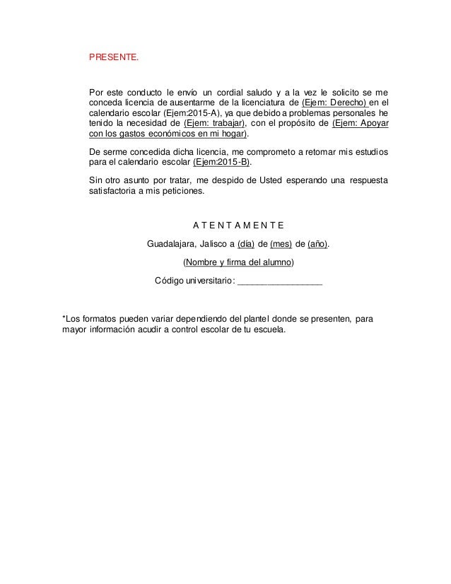 FORMATO SOLICITUD DE BAJA TEMPORAL O DEFINITIVA CÓDIGO UPMP -ACPO0101 REVISIÓN 0 REFERENCIA A LA NORMA NMX-CC-9001-IMNC-2008 751 PÁGINA 1 de 1 Fecha de solicitud. Escribo esta nota para hacer una solicitud formal de retiro de documentos. La Baja Definitiva se puede a dar a solicitud del estudiante o del tutor por una medida. Nayeli Judith Silva Martínez asistenteeaducuauhtemocedumx para que pueda confirmar y notificar a las áreas involucradas la baja en los sistemas administrativos. Solicitar la baja escolar del estudiante. Retirada de la escuela privada.