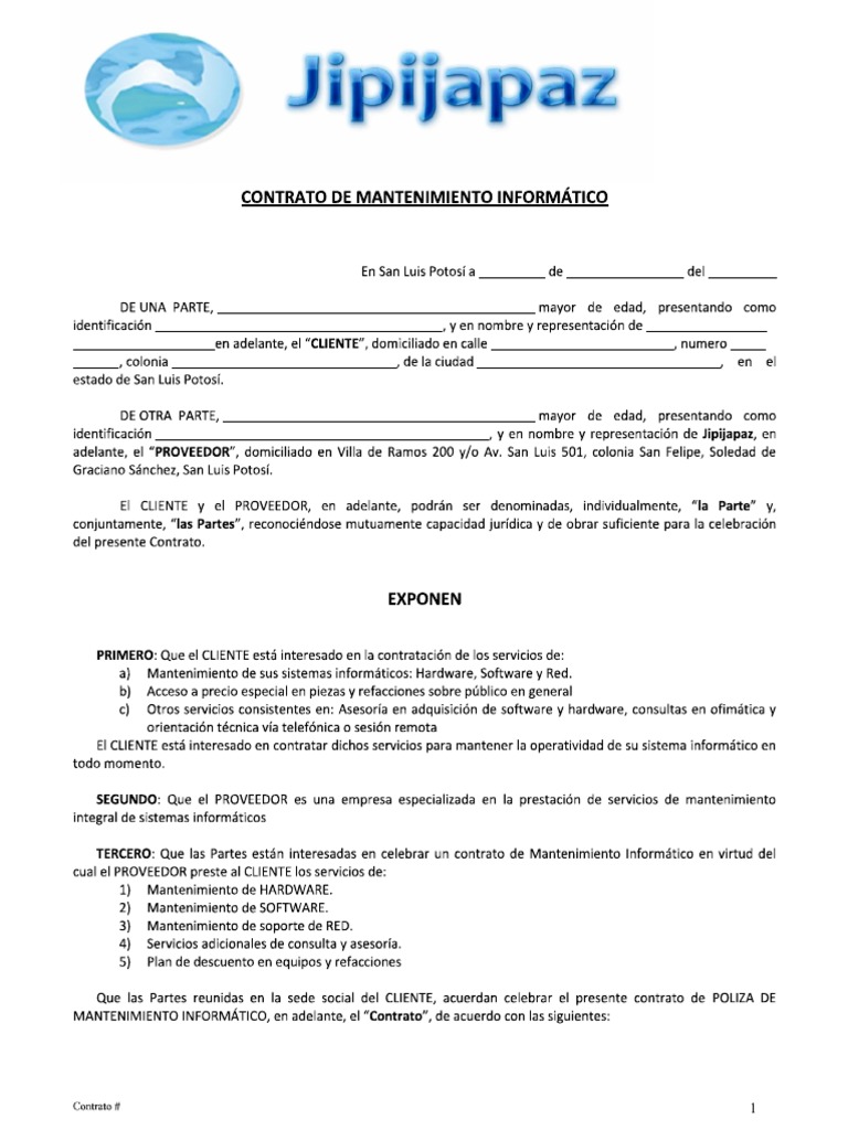 Contrato de mantenimiento informático - 32 El CLIENTE se obliga a hacer constar de forma clara visible y accesible desde sus. Revisará los importes del. Que las Partes están interesadas en celebrar un contrato de Mantenimiento Informático en virtud del cual el PROVEEDOR preste al CLIENTE los servicios de. Servicio de mantenimiento informático El contrato de mantenimiento informatico de tu empresa te ofrece garantía. B Mantenimiento de SOFTWARE. En Teziutlán Puebla a 17 de octubre de 2013 DE UNA PARTE Max Amaro Martínez mayor de edad presentando como identificación cédula profesional y en nombre y representación de Café internet Capri en adelante el CLIENTE domiciliado en calle Ferrer.