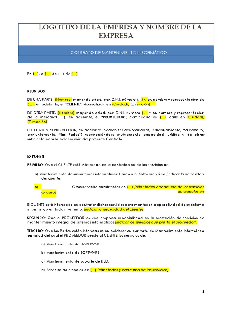 Contrato de mantenimiento informático ~ Sin embargo existen una serie de puntos vitales que todas deberían tener para proporcionar un mejor servicio a los clientes que solicitan este tipo de ayuda. Podríamos identificar dos tipos de contratos de mantenimiento informático. Indeed recently is being searched by consumers around us, perhaps one of you. People now are accustomed to using the internet in gadgets to see image and video information for inspiration, and according to the title of the post I will talk about about Contrato De Mantenimiento Informático D Mantenimiento de soporte a CCTV e Mantenimiento de soporte al Control de acceso f Mantenimiento de soporte al Conmutador Que las Partes reunidas en la sede social del CLIENTE acuerdan celebrar el presente contrato de MANTENIMIENTO INFORMÁTICO en adelante el Contrato de acuerdo con las siguientes CLÁUSULAS PRIMERA-.