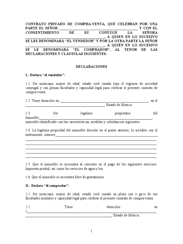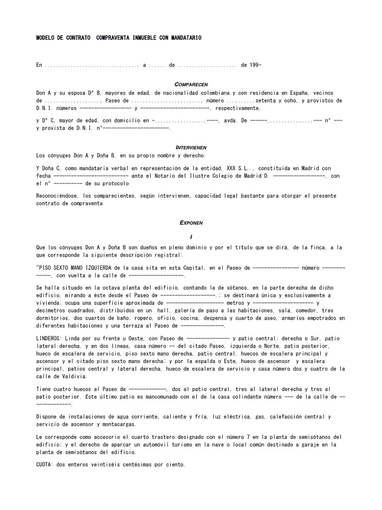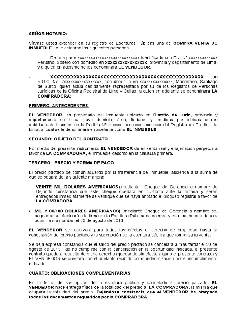 Soy vendedor y celebre un contrato privado de compra vetnta de un inmueble. La vigencia del presente contrato será de Dos años meses contados a partir del Junio 17 de 2021. MODELO DE CONTRATO DE COMPRAVENTA DE INMUEBLEEn la ciudad de San Josa a los 10 días del mes de Julio de 2016 entre Santiago Moreno en adelante EL VENDEDOR y Mario Cabrajo en adelante EL COMPRADOR se celebra este contrato de comp. Pagar el precio del arrendamiento dentro del plazo. Todo modelo de contrato de compraventa de casa debe contar con determinadas cláusulas. SEÑOR NOTARIO DE FE PÚBLICA.